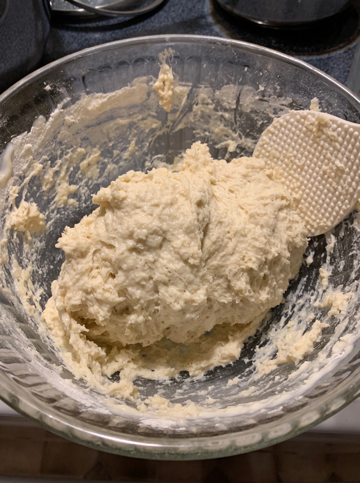 - Add the milk mixture to the bowl of flour and mix with spoon (I use a rice spoon) until fully combined, it should be VERY sticky