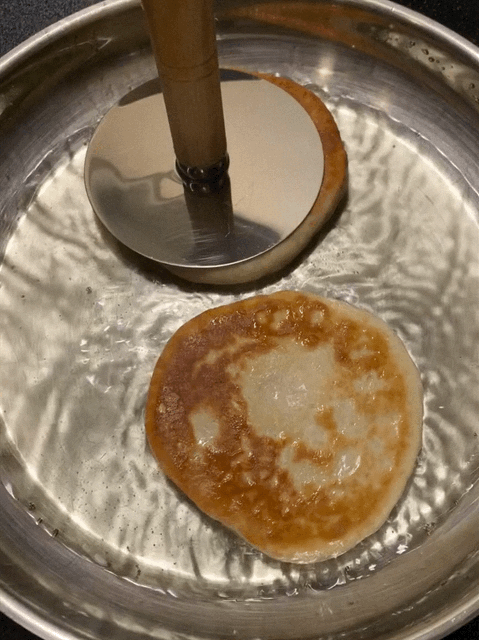 - Place the filled dough ball into the skillet and let cook until it’s golden brown underneath, then flip it and press down with a Hotteok pancake press or a large spatula, once golden brown, flip again and repeat.